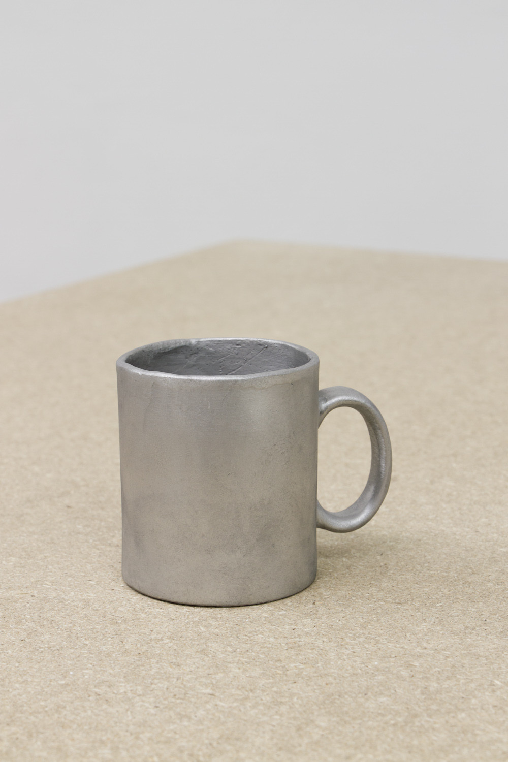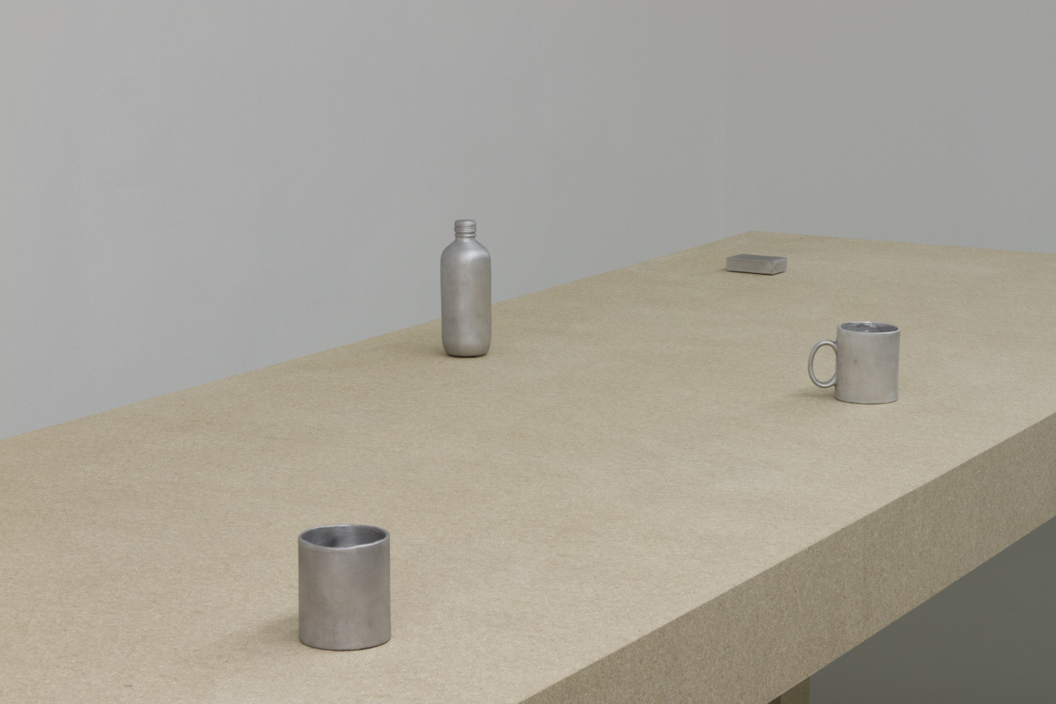 With the almost sacred quality of their product displays, the seductive aesthetics of their products, and the ostensibly self-evident nature of their presence amid large expanses of public space, corporations—particularly those that produce digital innovations— subliminally play with consumer desire. In his minimalist installation, Ruhry addresses the subtle displays found in these stores and presents a selection of everyday objects cast in aluminum from the context of the train station in place of digital devices. Made abstract due to their materiality and elevated as unique items, their auratic presentation simultaneously enhances them and separates them from their original utility and commercial value. The emotional, affirmative messages of companies in the digital sector cause their customers to overlook the fact that by buying a product or joining a network, not only are they giving up control over their own identity and personal information, but they are also contributing to the closed loop of an increasingly independent market.
